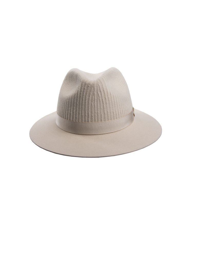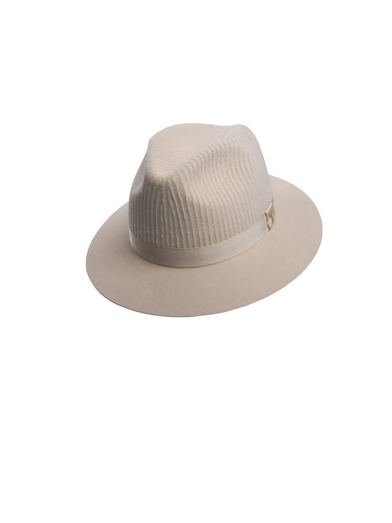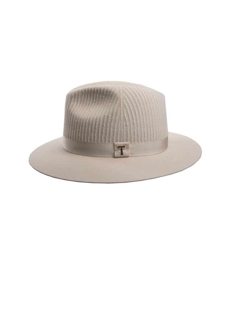 Elegantiška, švelnaus kreminio atspalvio Fedora skrybėlė su tekstūruota karūna. Minimaliai puošta juostele bei T ženklu. Bryliaus krašto plotis 6,5 cm. Skrybėlė turi medžiaginę prakaito juostą.