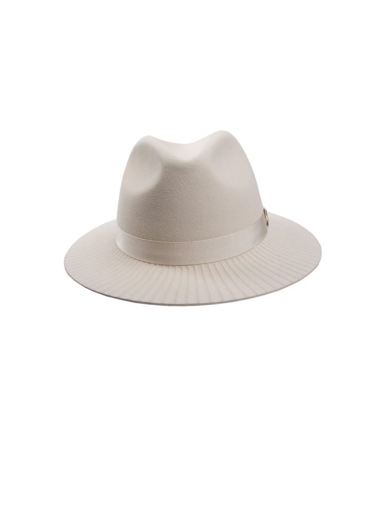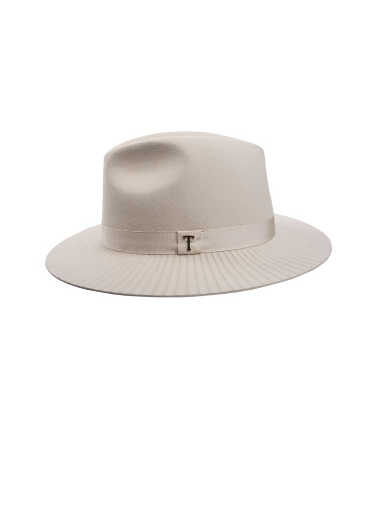 Elegantiška, švelnaus kreminio atspalvio Fedora skrybėlė su tekstūruotu bryliumi. Minimaliai puošta juostele bei T ženklu. Krašto plotis 6,5 – 7 cm. Skrybėlė turi medžiaginę prakaito juostą.