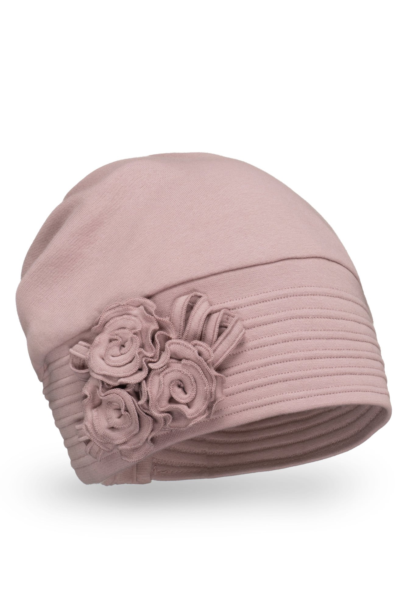 Moteriška kepurė FILJA pagaminta iš sertifikuotos, dvigubo sluoksnio minkštos medvilnės. Tai rankų darbo produktas! Žaismingumo kepuraitei suteikia suformuotos, prasiūtos pasikartojančios bangelės. Šone puošta tos pačios spalvos žiedlapių aplikacija. Nugarinėje dalyje yra įsiūta tampri juostelė, kas kepuraitės dydį daro dar universalesnį. Kepuraitės viršutinė dalis yra laisvesnė dėl nugarinėje dalyje suformuotų, persidengiančių medžiagos sluoksnių. Puikiai prisitaikys prie bet kokios galvos formos.
