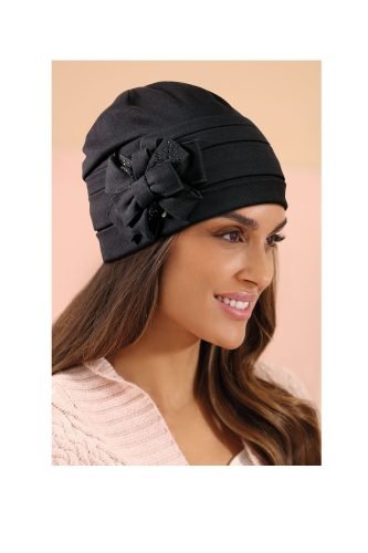 Stilinga kepurė STINE pagaminta iš minkštos, dvigubo sluoksnio medvilnės. Dekoruota tos pačios spalvos kaspinu bei žėrinčiais kristalais. Originalumo kepurei suteikia persidengiantys medžiagos sluoksniai. Nugarinėje kepurės dalyje yra tampri juostelė, tad modelis puikiai prisitaiko prie bet kokios galvos formos.