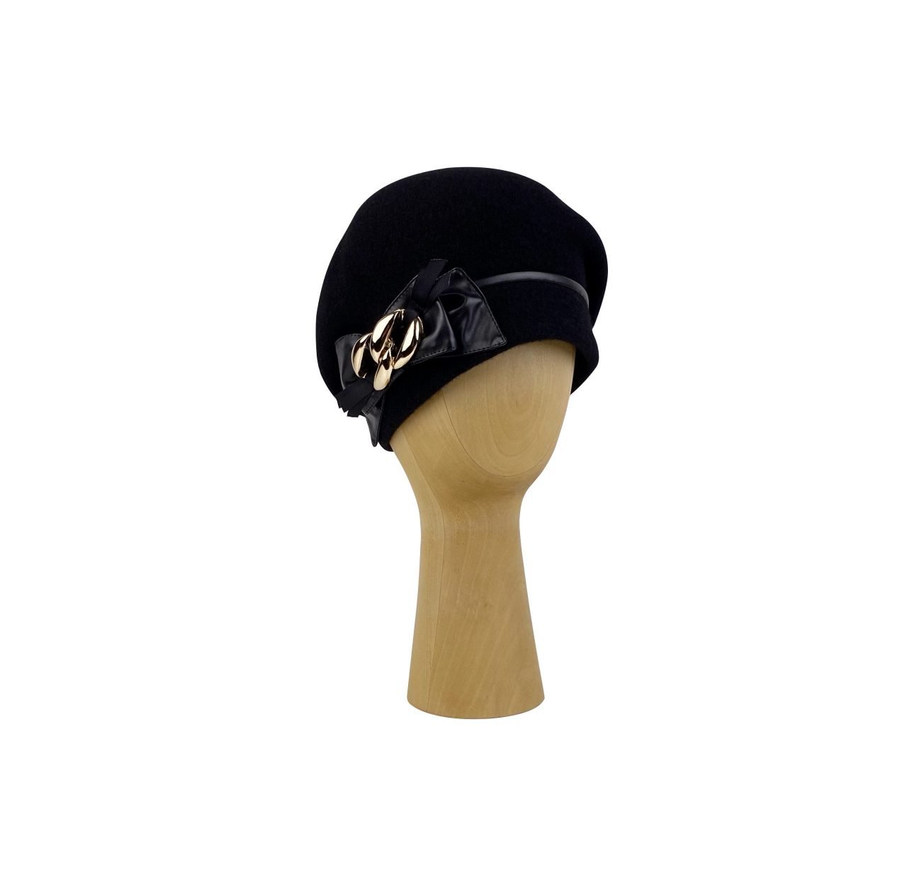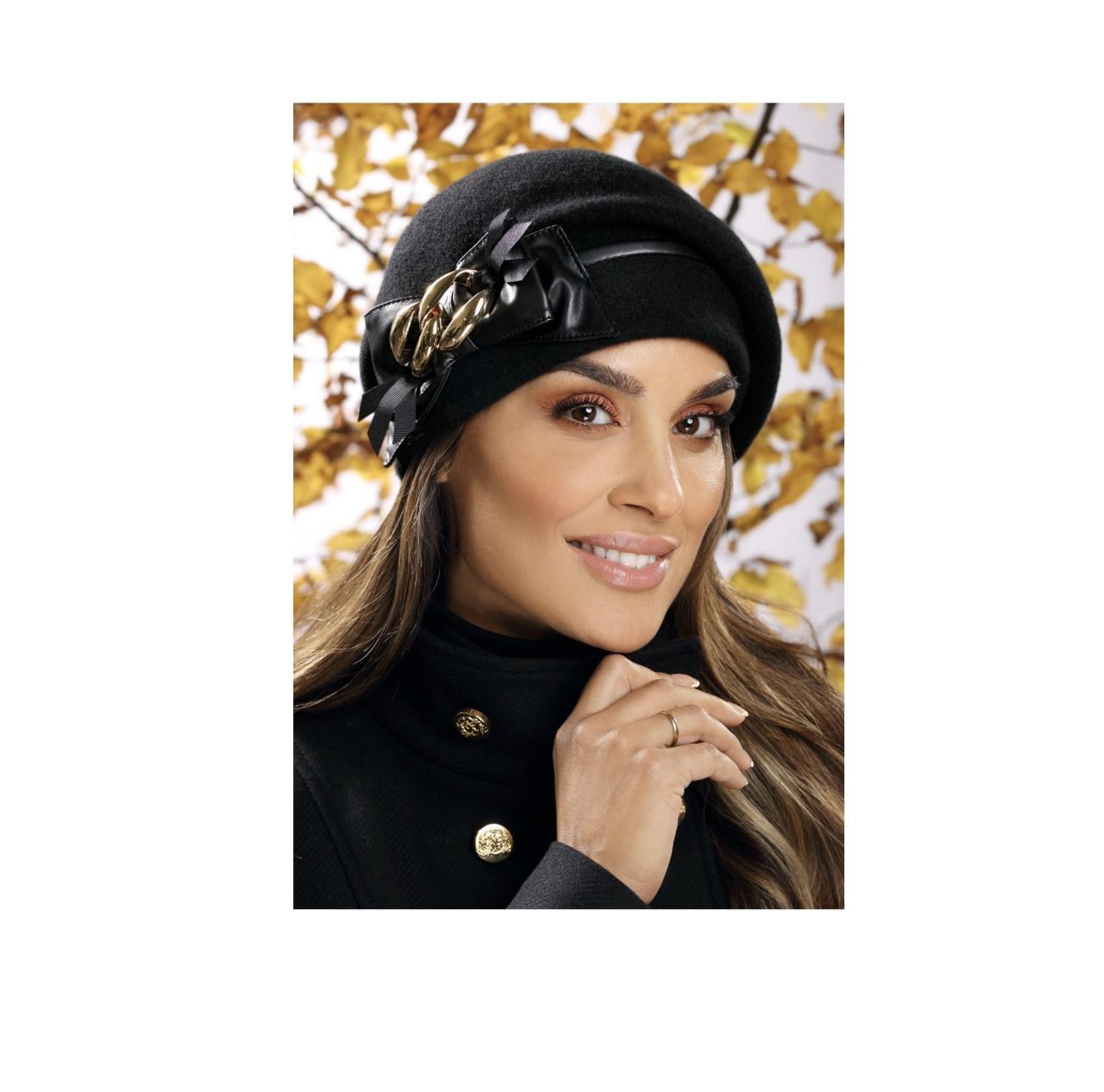 Kepurė/ beretė NILTIV pagaminta iš aukščiausios kokybė vilnos, sertifikuotos “Woolmark” ženklu. Tai labai elegantiškas bei moteriškas modelis. Kepuraitė dekoruota eko odos ir aukso spalvos grandinės elementais. Nugarinėje dalyje – tampri juostelė, tad kepurė/ beretė puikiai prisitaiko prie galvos formos, dydžio.