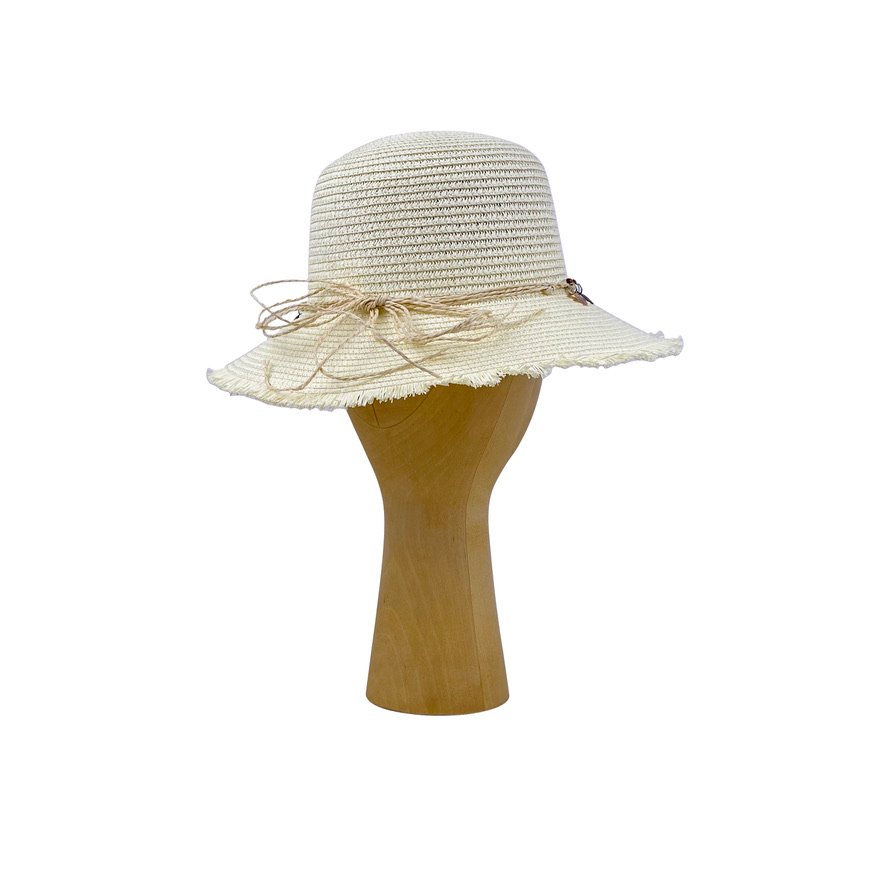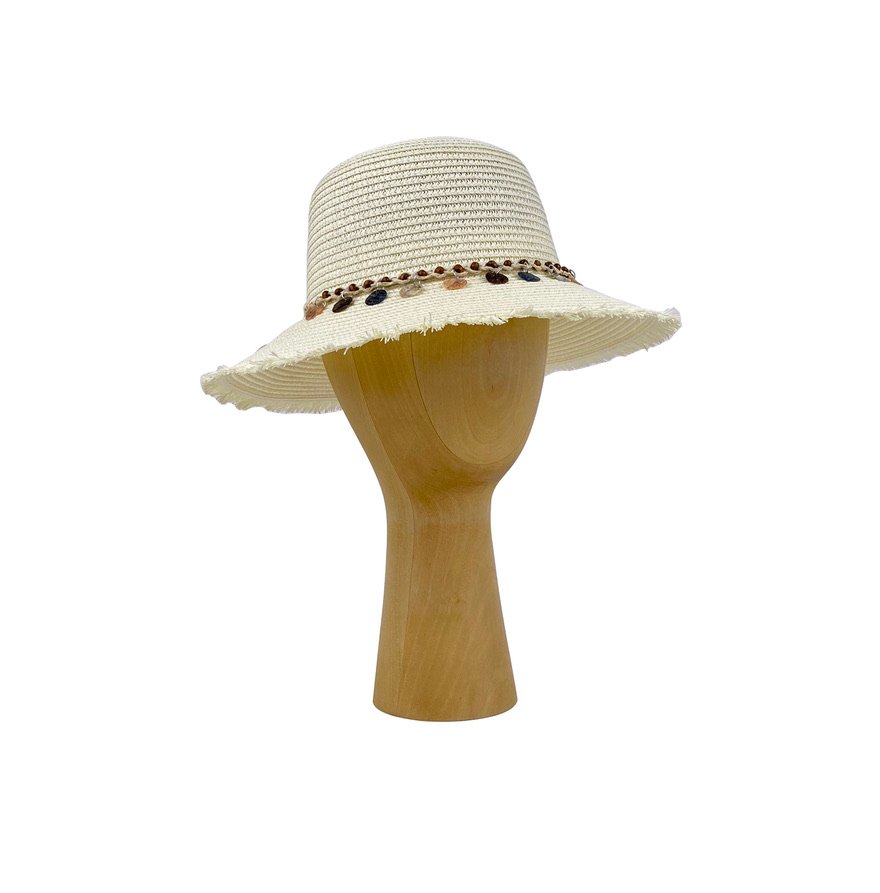 Moteriška vasarinė skrybėlė su medžiagine prakaito juosta. Skrybėlė puošta bižuteriniais plokščiais akmenėliais. Skrybėlės skersmuo – 34 cm., bryliaus plotis – 8, 8,5 cm. Dengia veidą, pralaidi orui.