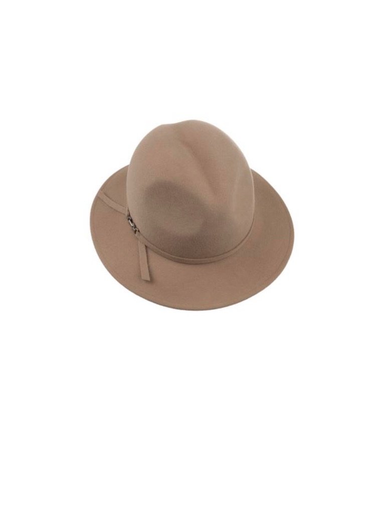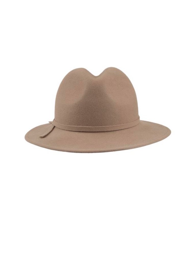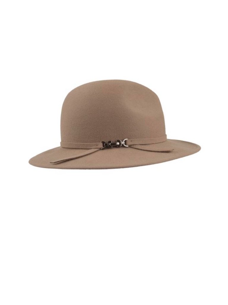 Aukštos kokybės, moteriška, plono fetro, Fedoros stiliaus skrybėlė 52814. Skrybėlė dekoruota siaura fetrine juostele su maža sagtimi. Skrybėlės kraštas – apsiūtas. Modelio viduje – elastinga medžiaginė prakaito juosta.