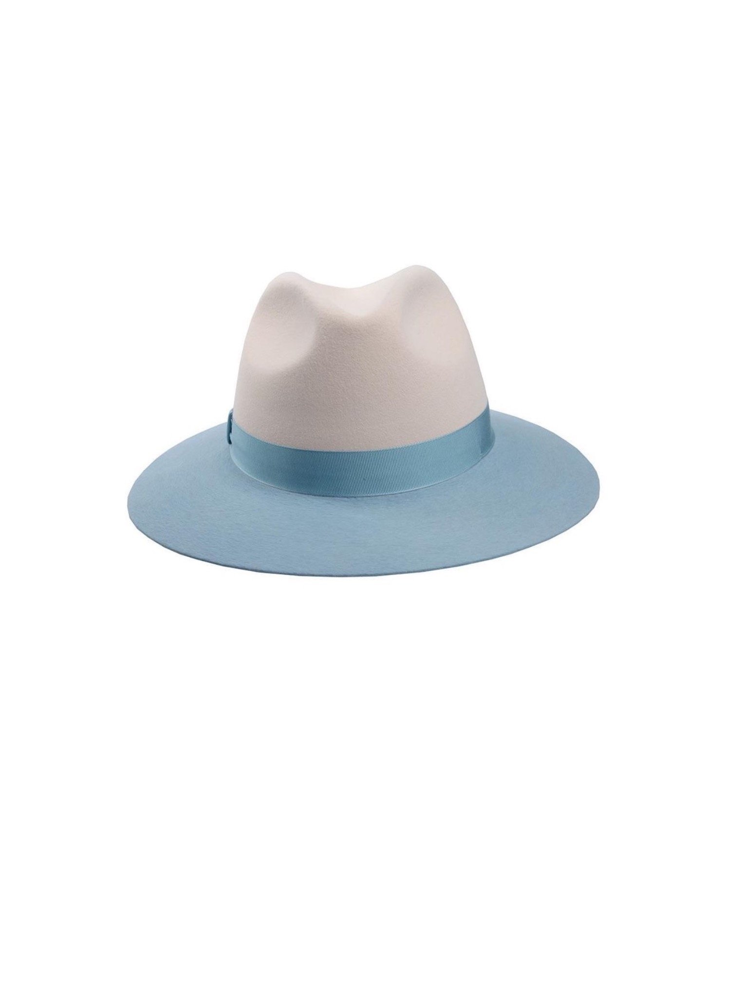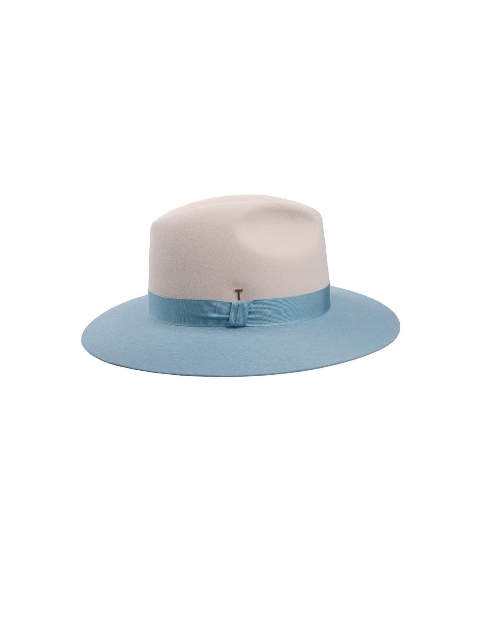 Dviejų atspalvių skrybėlė Essence Duo yra klasikinės fedoros formos su plačiu, tiesiu krašteliu 7 – 7,5 cm. Skrybėlės grakščius išlinkimus paryškina dangaus mėlynos ir švelnios kreminės spalvos derinys. Nepastebima juostelė ir T segtukas užbaigia subtilią skrybėlės liniją.